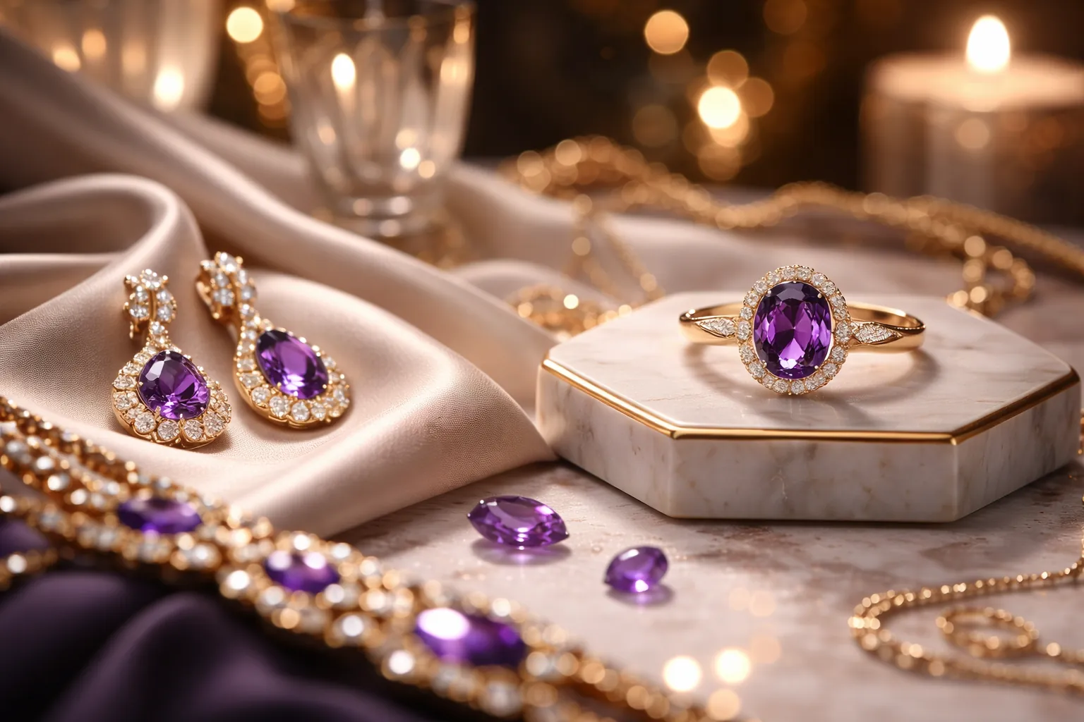 Minimalistyczny luksus z nutą magii: czyste linie, szlachetny połysk i fioletowy kamień jak punkt światła. Limitowane dropy + projekty na zamówienie.